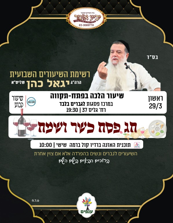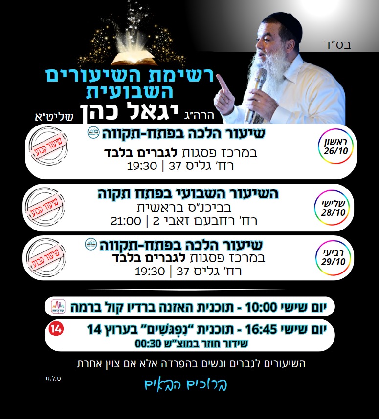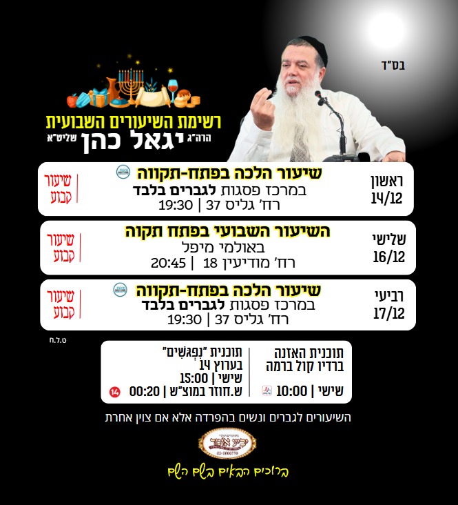 לוח שיעורים שבועי של בית מדרש יביע אומר בראשות הרב יגאל כהן שליט"א, זמני קיץ