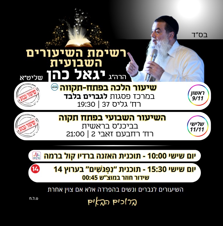 לוח שיעורים שבועי של בית מדרש יביע אומר בראשות הרב יגאל כהן שליט"א, זמני קיץ